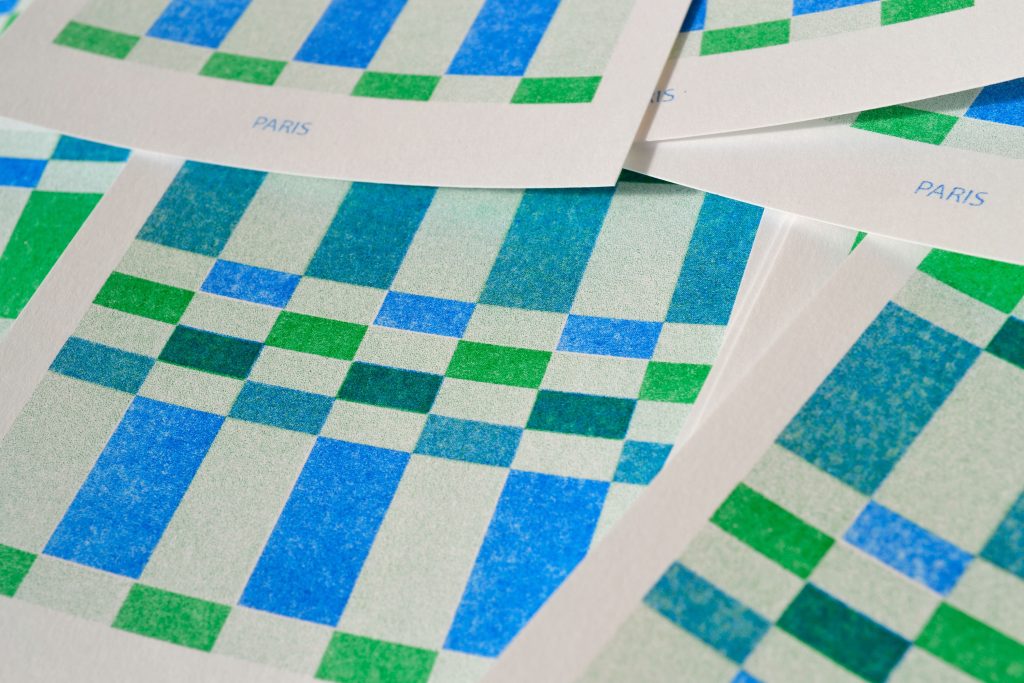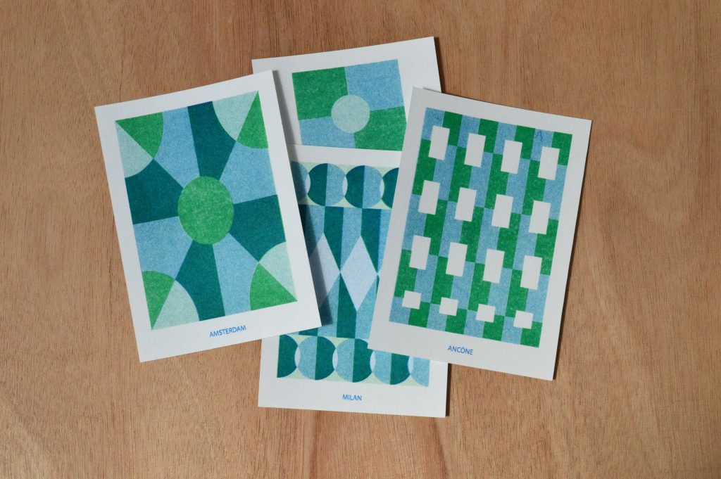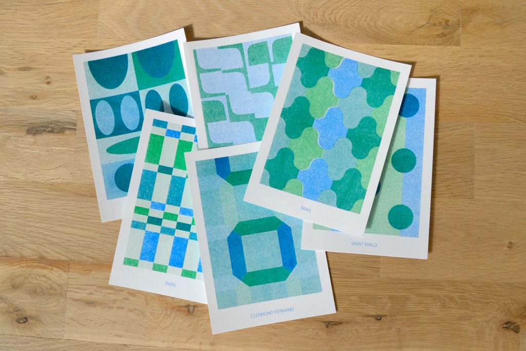 Collection de cartes postales Série de cartes postales en risographie, bichromie2022/202310x15cmimprimée par l’atelier Fête d’abord, Rennes Crédit photo : Romane Poyard