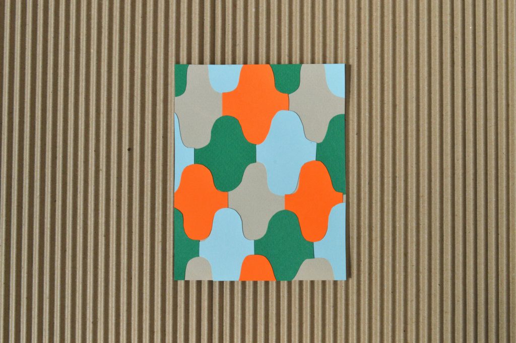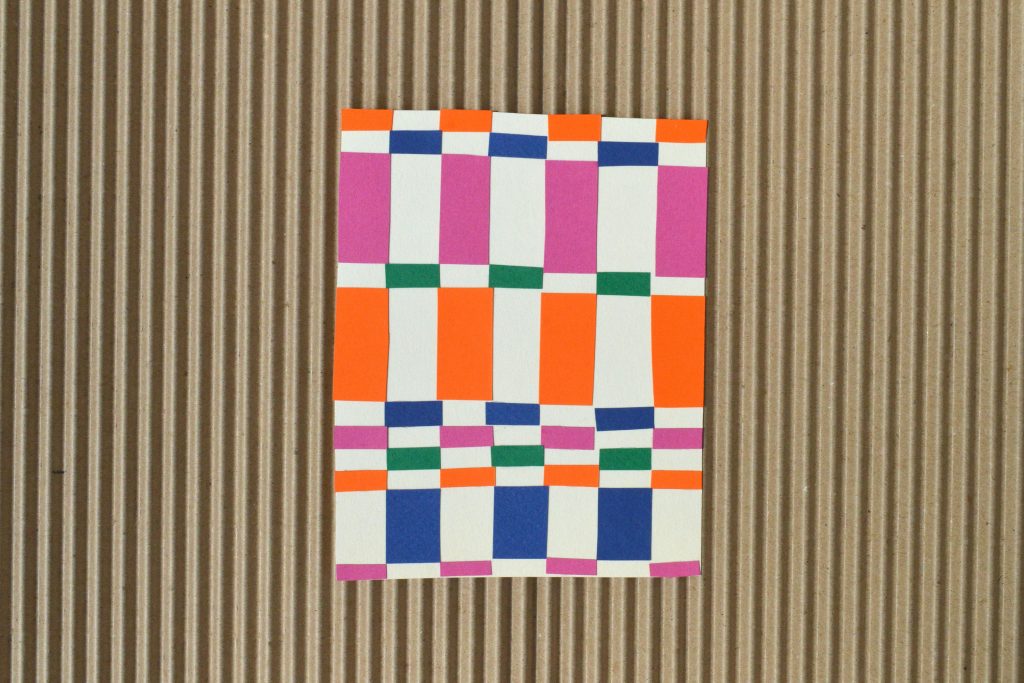 Découpage collage Papiers couleurs, formats variables2023 Expérimentations de découpage collage manuel autour des visuels des tapis Crédit photo : Romane Poyard