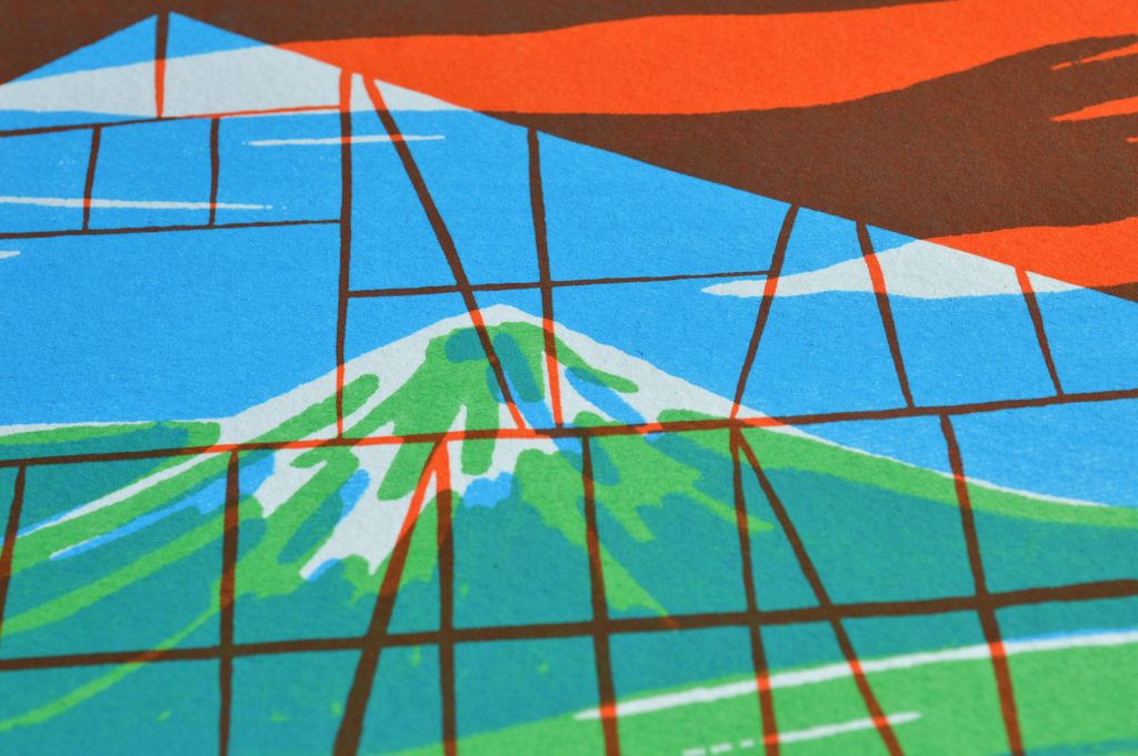Montagnes vosgiennes et colombages alsaciens sérigraphie, trichromie2023réalisée avec le designer plasticien Valérian Henry21 x 29,7cmimprimée par nos soins à l’atelier La bonne pioche Crédit photo : Romane Poyard